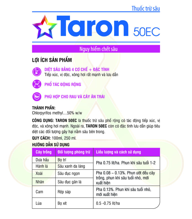 Taron 50EC chứa Chlorpyrifos Methyl (min 96%) có công dụng trong việc phòng, điều trị các loại sâu bệnh hoặc các vấn đề cây trồng trong Nông nghiệp.